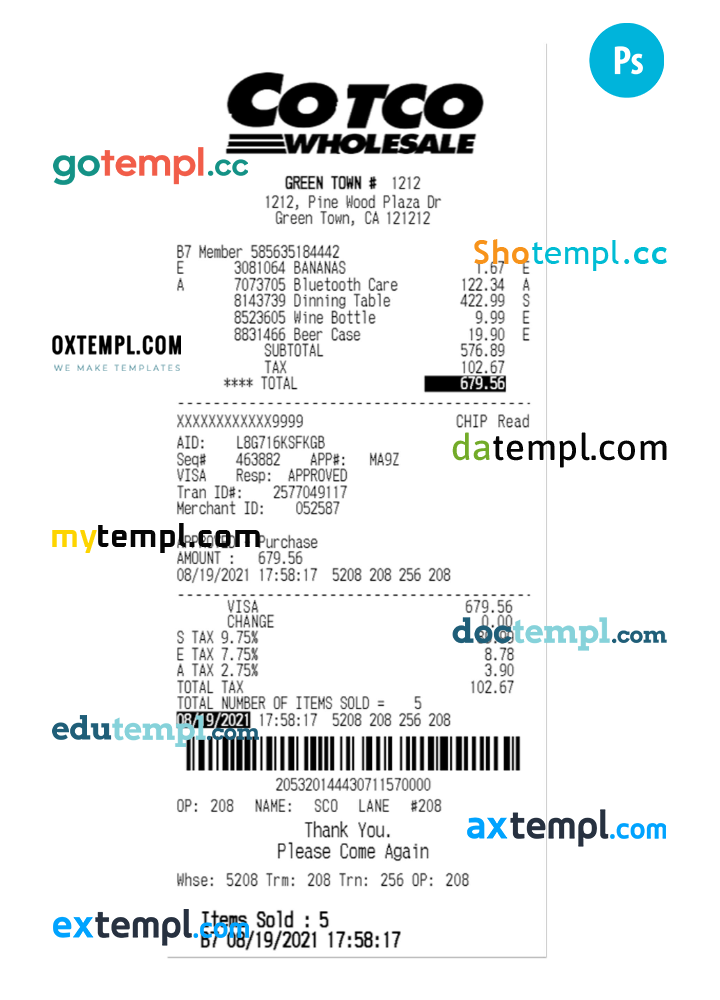 COTCO WHOLESALE payment receipt PSD example
