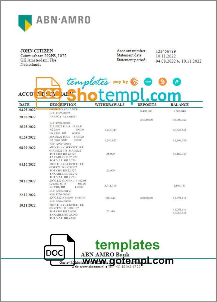 Completely editable Dutch ABN AMRO bank statement 3 – 6 months example in doc format. High-quality easy fillable example.
