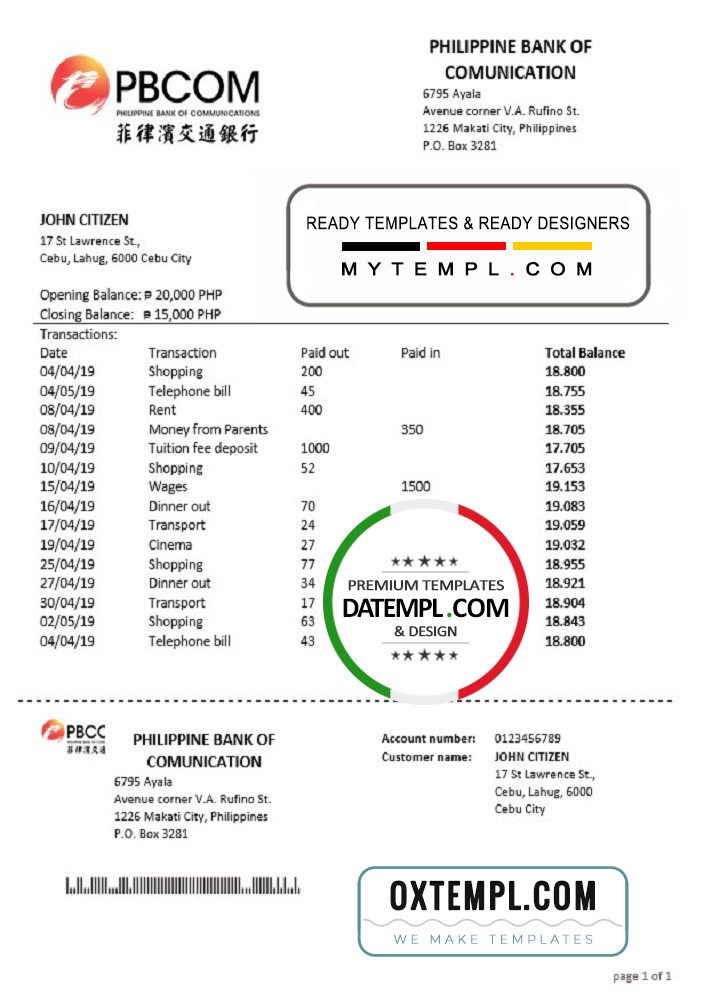 Filipino Bank of Communications proof of address bank statement 3 – 6 months example in Word and PDF format