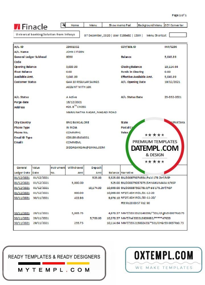 India Finacle bank statement easy to fill template in Word and PDF format