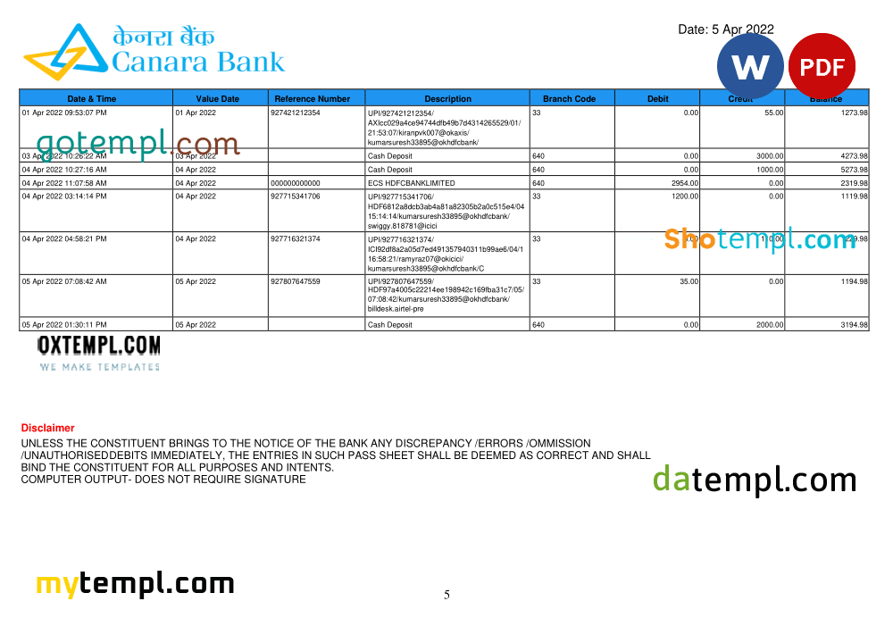 Like all our documents, Indian Canara bank statement 3 – 6 months example is of high quality.