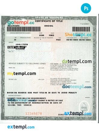 Completely editable United States state Iowa certificate of title of a vehicle example in PSD format.