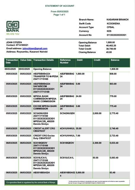 Kenya Co-operative Bank statement Word and PDF template, version 2