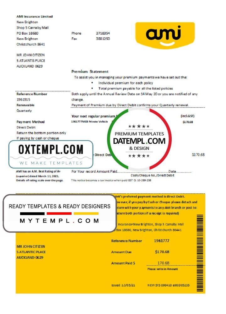 New Zealand Ami Insurance Limited Bank statement example of high quality, which may be used as a proof of address in many sites.