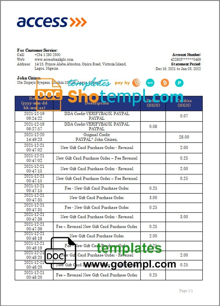 Completely editable Nigerienia Access bank statement 3 – 6 months example in .doc format. High-quality easy fillable example.