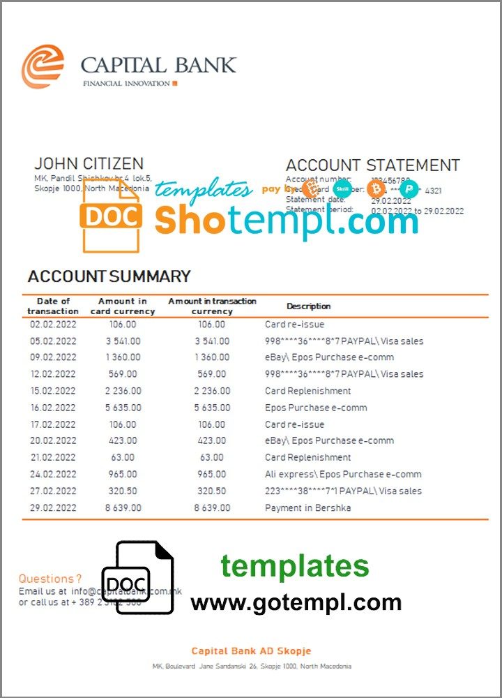 Completely editable North Macedonia Capital Bank bank statement 3 – 6 months example in doc format. High-quality easy fillable example.
