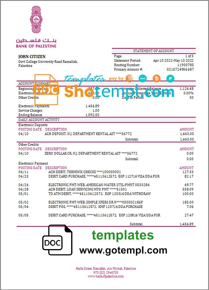 GB: palestine palestinian bank statement 3 – 6 months microsoft excel spreadsheets worksheet data xls xlsx files formulas sums calculated automatically electronic spreadsheets sheets columns columns kyc proof address verification verification fake print real blank paper energy gas gas water electric pdf psd example monthly billing bills free download 2020 2021 2022