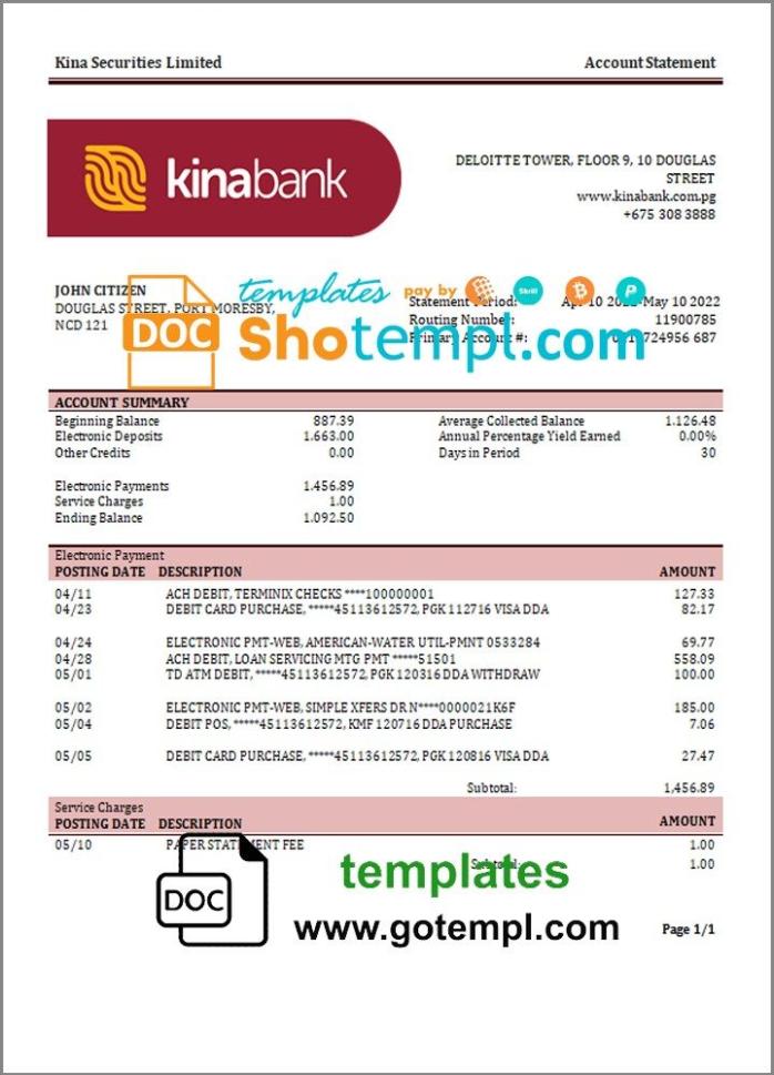 Completely editable Papua New Guineann Kina Securities Limites bank statement 3 – 6 months example in doc format. High-quality easy fillable example.