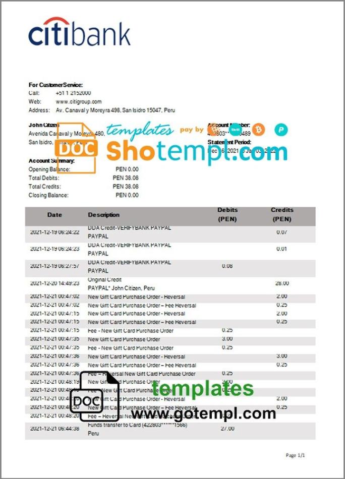 Completely editable Peruvian Citibank bank statement 3 – 6 months of high quality, which may be used as a proof of address in many sites.