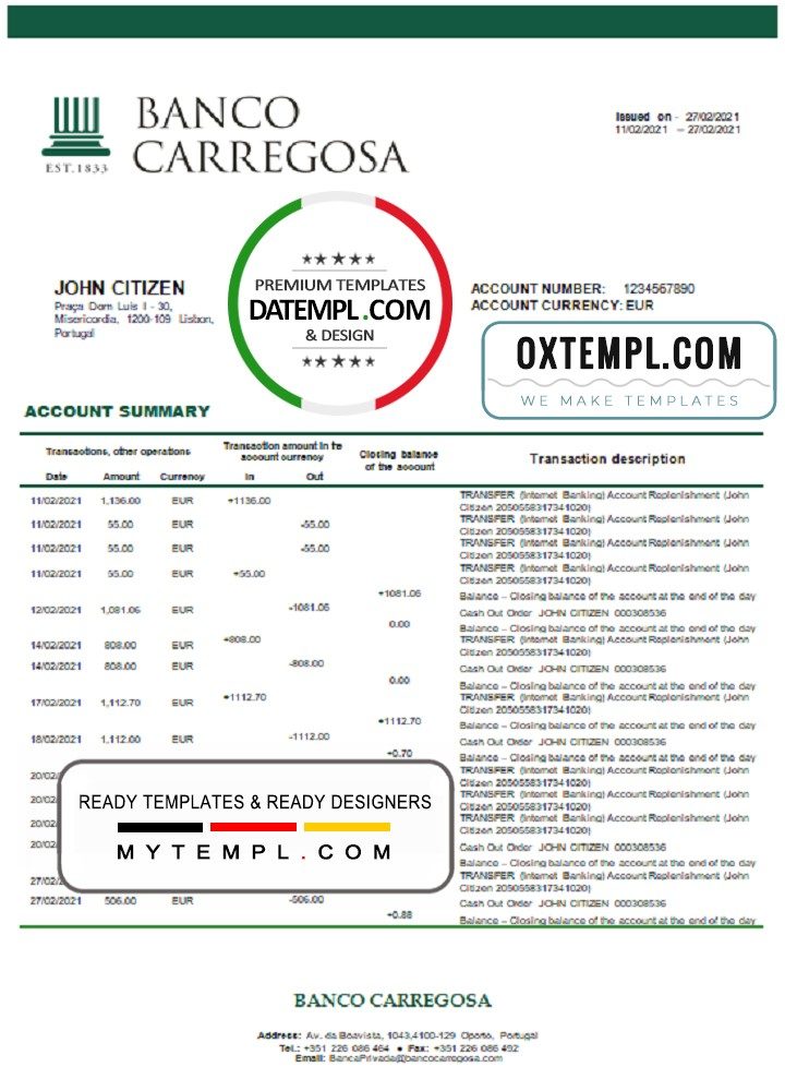 Fully editable example of Portuguese Banco Carregosa bank statement 3 – 6 months. The example is in doc format, high-quality and easy to fill.