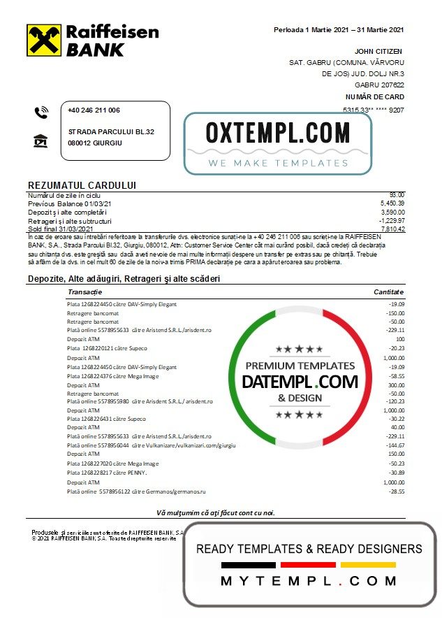 Romanian Raiffeissen Bank statement example of high quality (in Romaniann language), which may be used as a proof of address in many sites.