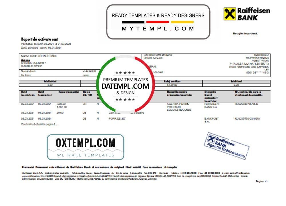 Completely editable Romanian Raiffeisen bank statement example of high quality, which may be used as a proof of address in many sites.