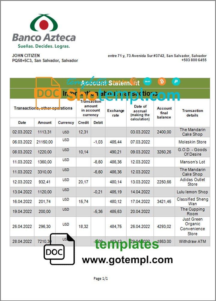 Completely editable Salvador Banco Azteca bank statement 3 – 6 months of high quality, which may be used as a proof of address in many sites.