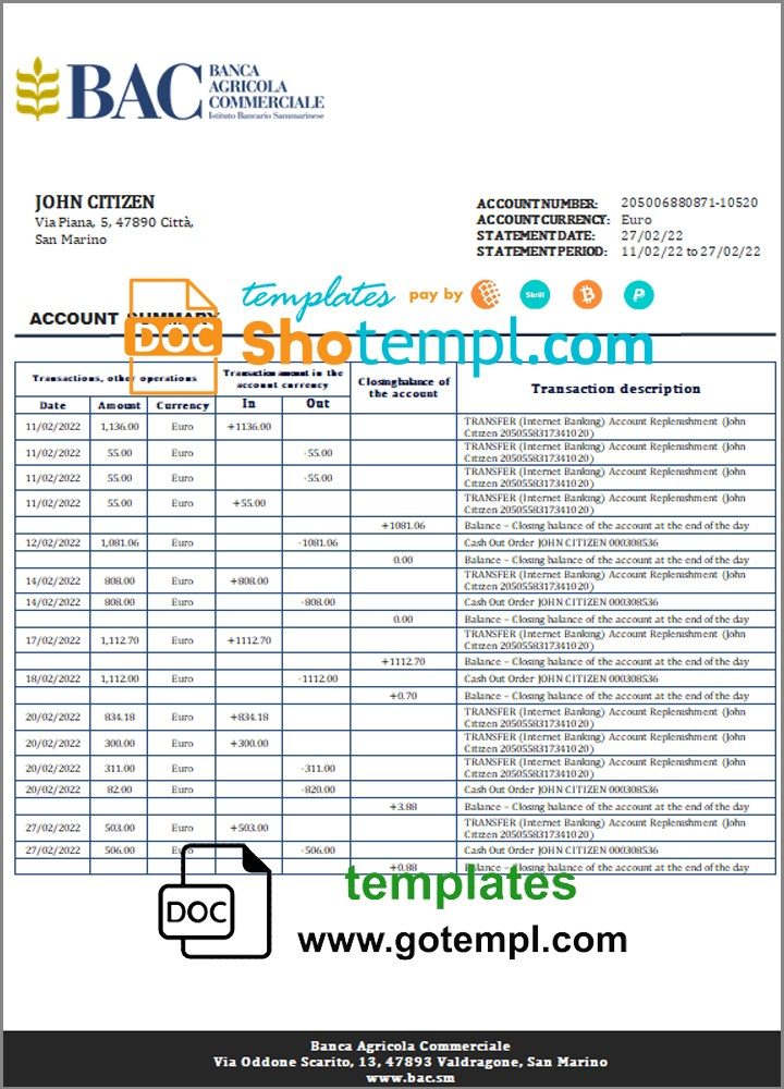 Completely editable San Marino Banca Agricole Commerciale bank statement 3 – 6 months of high quality, which may be used as a proof of address in many sites.