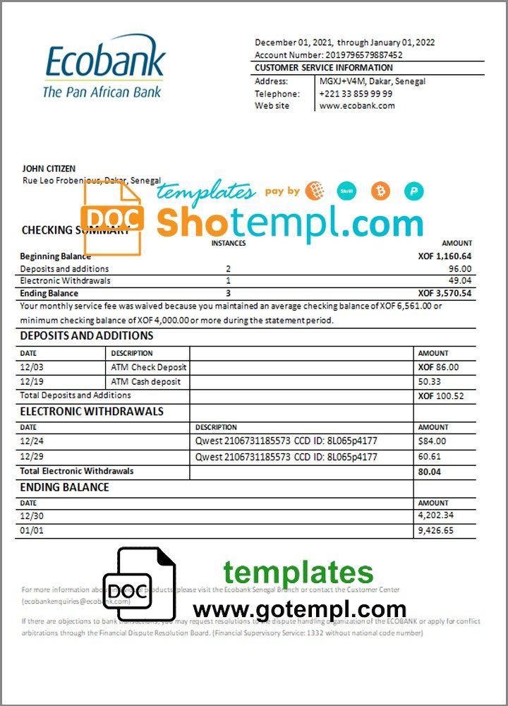 Completely editable Senegalese Ecobank bank statement 3 – 6 months of high quality, which may be used as a proof of address in many sites.