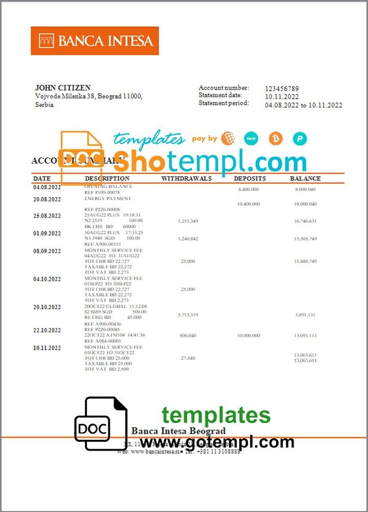 GB: Serbian bank statement 3 – 6 months microsoft excel spreadsheets worksheet data xls xlsx files formulas sums calculated automatically electronic spreadsheets sheets columns columns kyc proof address verification verification fake print real blank paper energy gas gas water electric pdf psd example monthly billing bills free download 2020 2021 2022