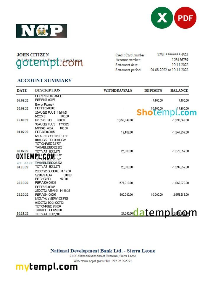 Completely editable Sierra Leone National Development Bank statement xls sample is of high quality, which may be used as a proof of address in many sites.