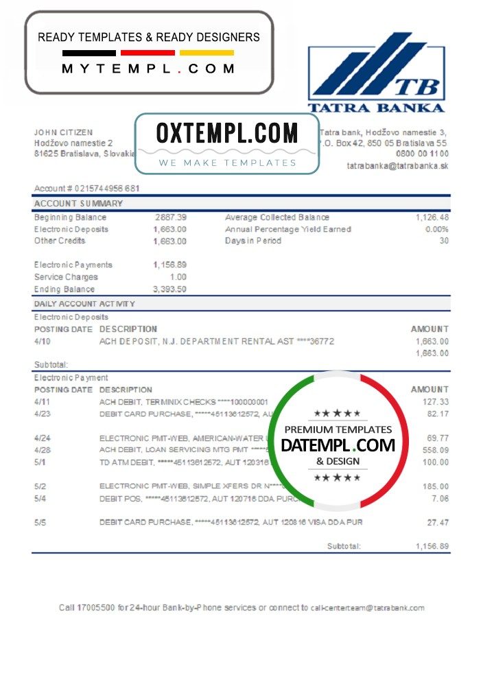 Slovak Tatra Bank statement example of high quality, which may be used as a proof of address on many sites.