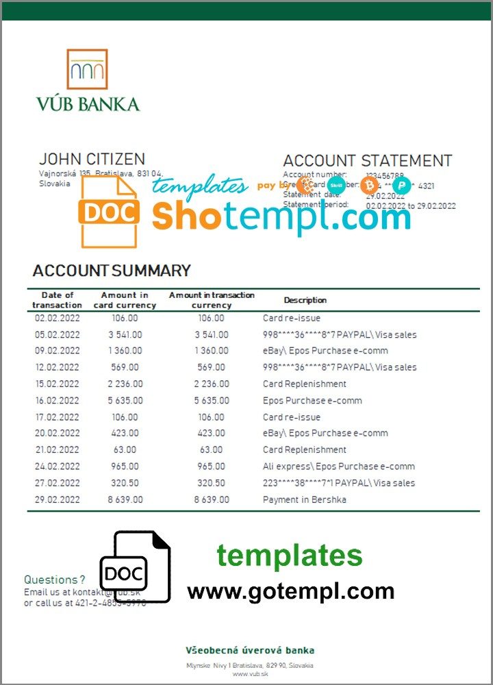 Completely editable Slovak VUB bank statement 3 – 6 months of high quality, which may be used as a proof of address in many sites.
