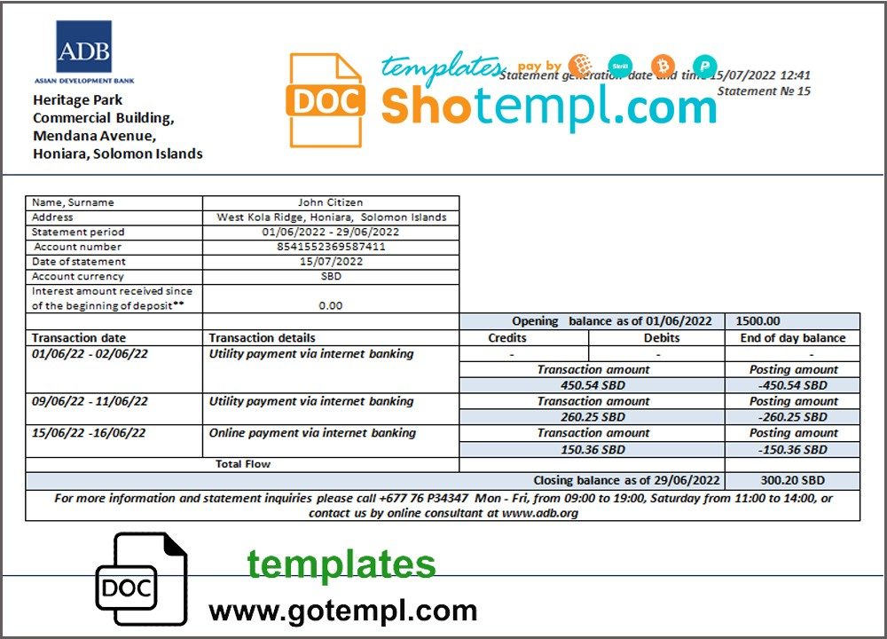 Completely editable Solomon Islands ADB bank statement 3 – 6 months of high quality, which may be used as a proof of address in many sites.