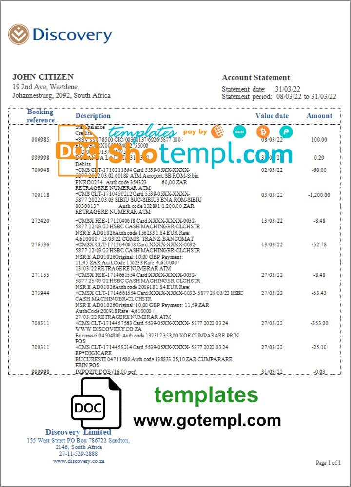 Completely editable South African Discovery bank statement 3 – 6 months of high quality, which may be used as a proof of address in many sites.