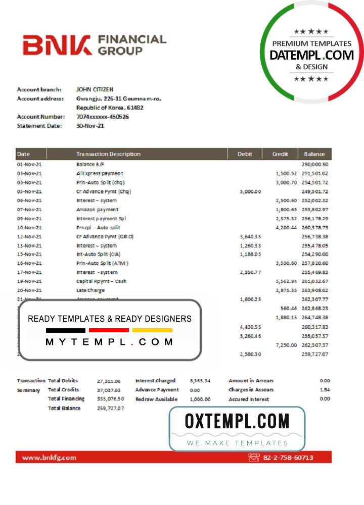 Completely editable South Koreann BNK bank statement example of high quality, which may be used as a proof of address in many sites.