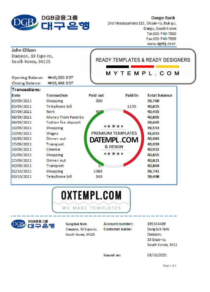 Completely editable South Korean Daegu statement of high quality, which is a proof of the available balance from the bank.