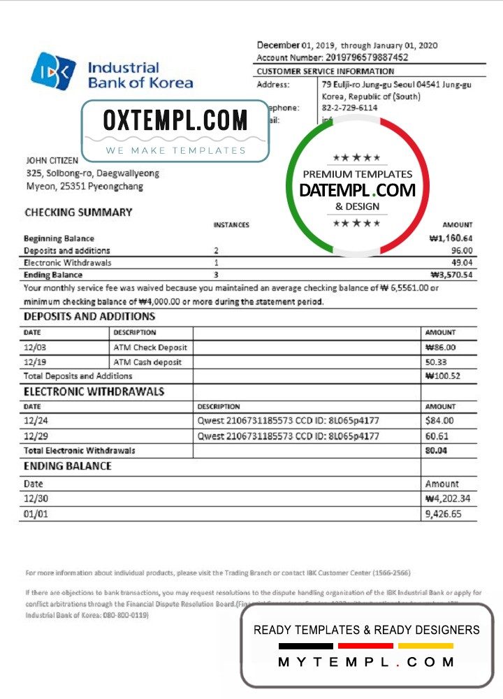 Completely editable South Korea Industrial Bank of Korea bank statement 3 – 6 months of high quality, which may be used as a proof of address in many sites.