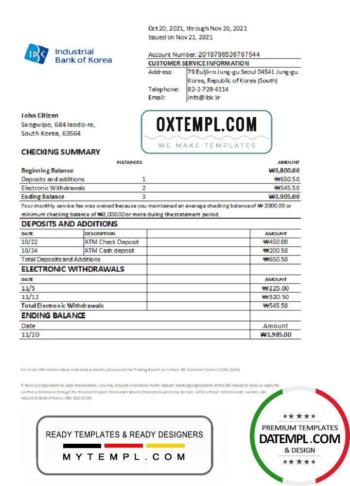 Completely editable South Korea Industrial Bank of Korea bank statement 3 – 6 months of high quality, which may be used as a proof of address in many sites.