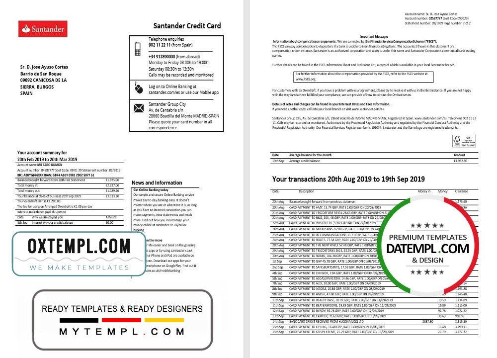 Spanish Santander credit card statement example, Word and PDF format (.doc and .pdf), 2 pages