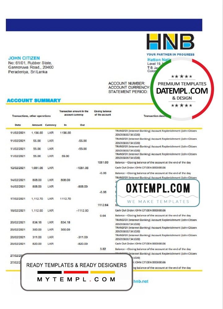 Sri Lanka Hatton National Bank statement example of high quality, which may be used as a proof of address in many sites.