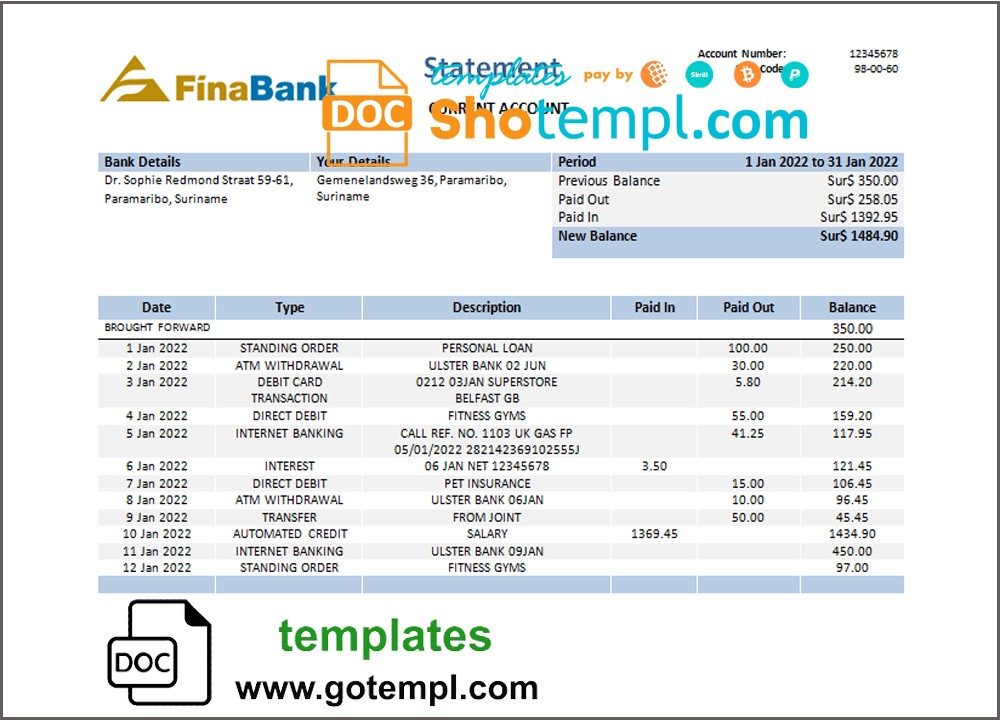 GB: suriname bank statement 3 – 6 months microsoft excel spreadsheets worksheet data xls xlsx files formulas sums calculated automatically electronic spreadsheets sheets columns columns kyc proof address verification verification fake print real blank paper energy gas gas water electric pdf psd example monthly billing bills free download 2020 2021 2022
