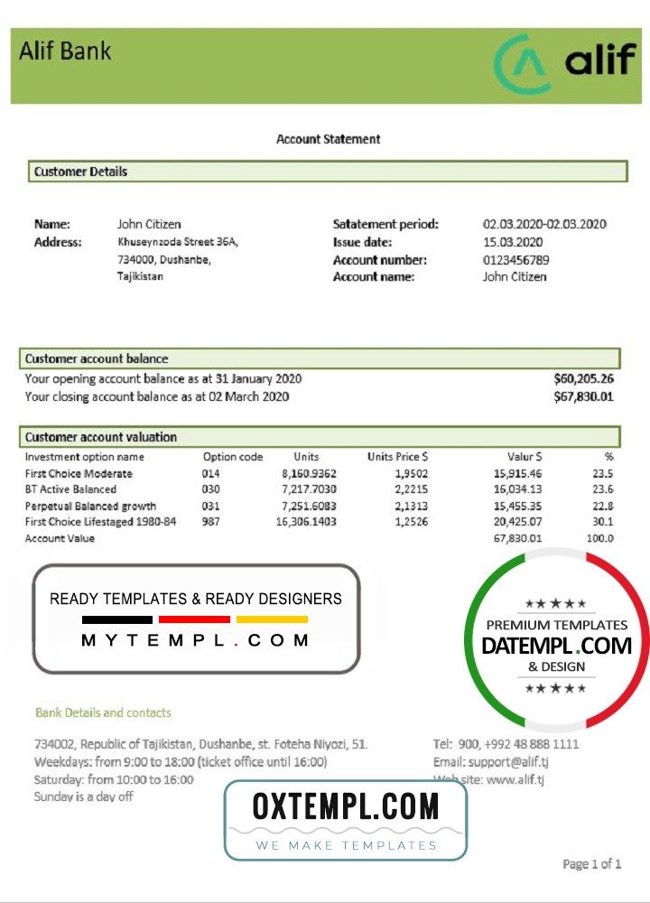 This banking example is editable sample of Tajikistani Alif Bank statement in doc format. Edit it with MS Word.
