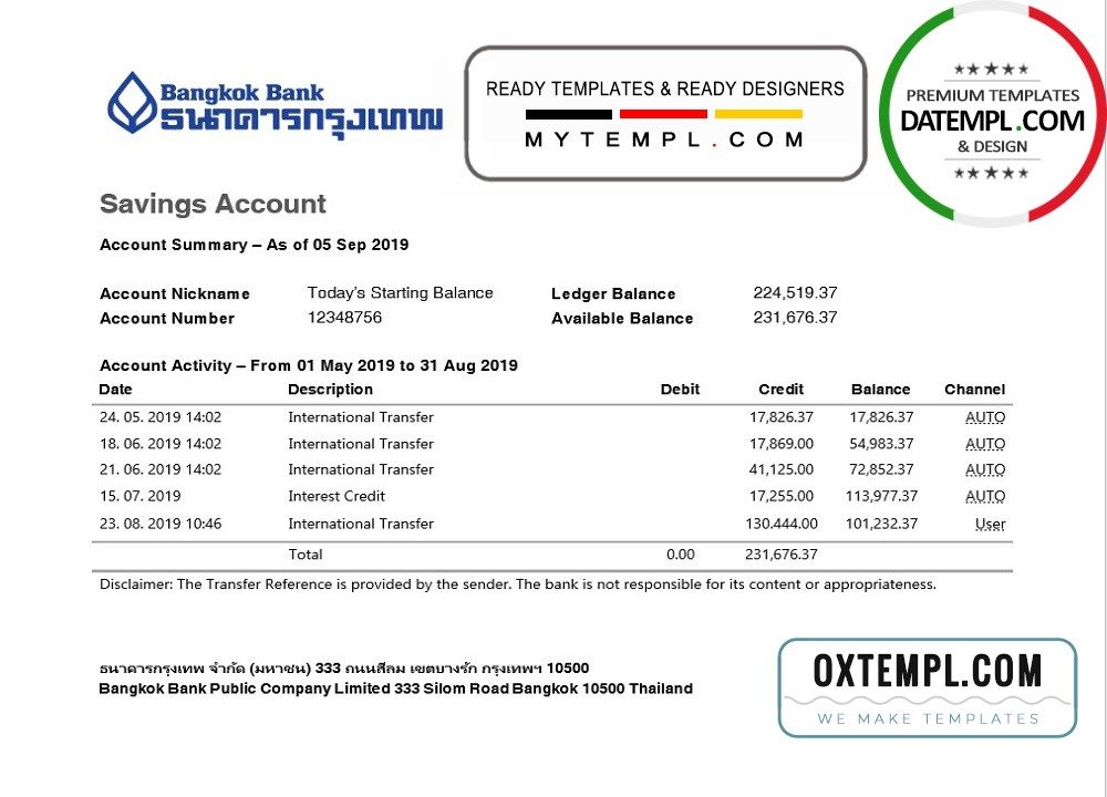 Completely editable Thailand Bangkok Bank Savings Account statement of high quality, which may be used as a proof of address in many sites.