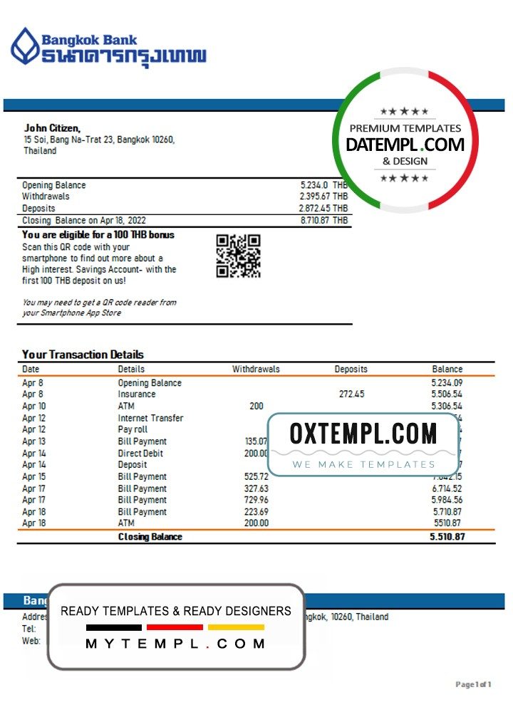 Completely editable Thailand Bangkok Bank statement example of high quality, which may be used as a proof of address in many sites.