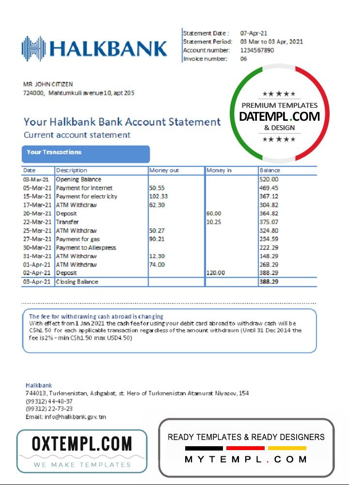 Turkmen Halkbank Bank statement easy to fill example in .xls and .pdf file format