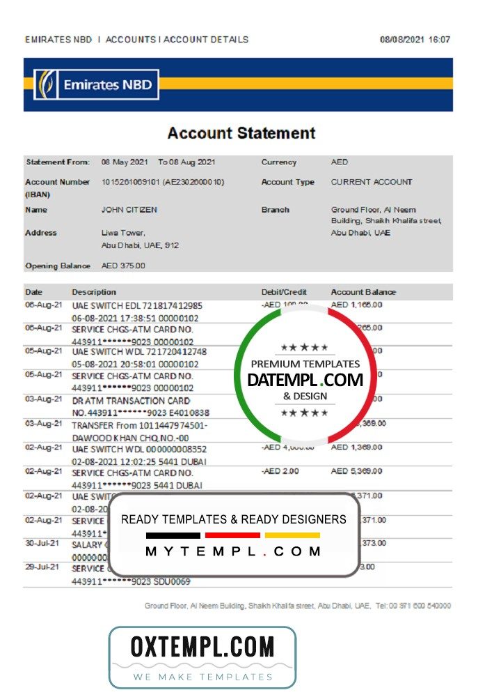 UAE Abu Dhabi Emirates NBD bank statement 3 – 6 months example in Word and PDF format, good for address prove