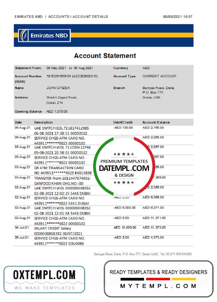 Completely editable UAE Dubai Emirates NBD bank statement 3 – 6 months of high quality, which may be used as a proof of address in many sites.
