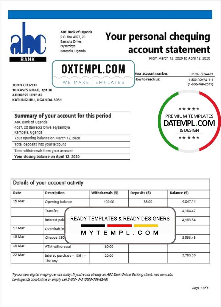 Completely editable Uganda ABC Bank of Uganda statement of high quality, which is a proof of the available balance from the bank.