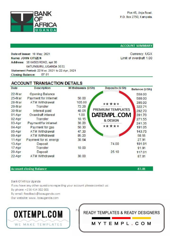 Completely editable Uganda Bank of Africa bank statement example of high quality, which may be used as a proof of address in many sites.