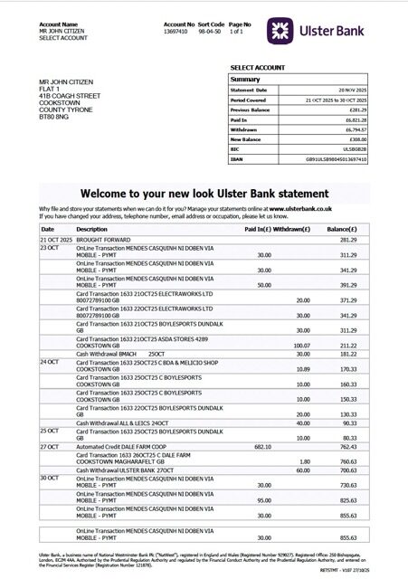 Like all our documents, this UK Ulster Bank statement example is of high quality, which may be used as a proof of address in many sites.