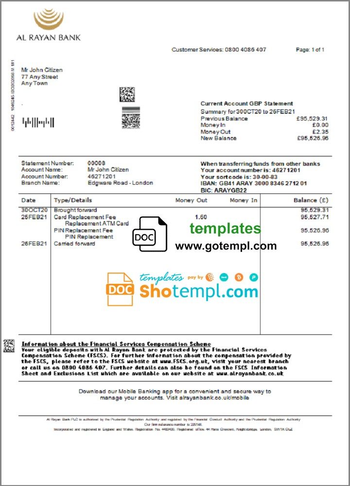 Completely editable United Kingdom Al Rayan bank statement 3 – 6 months example of high quality, which may be used as a proof of address in many sites.