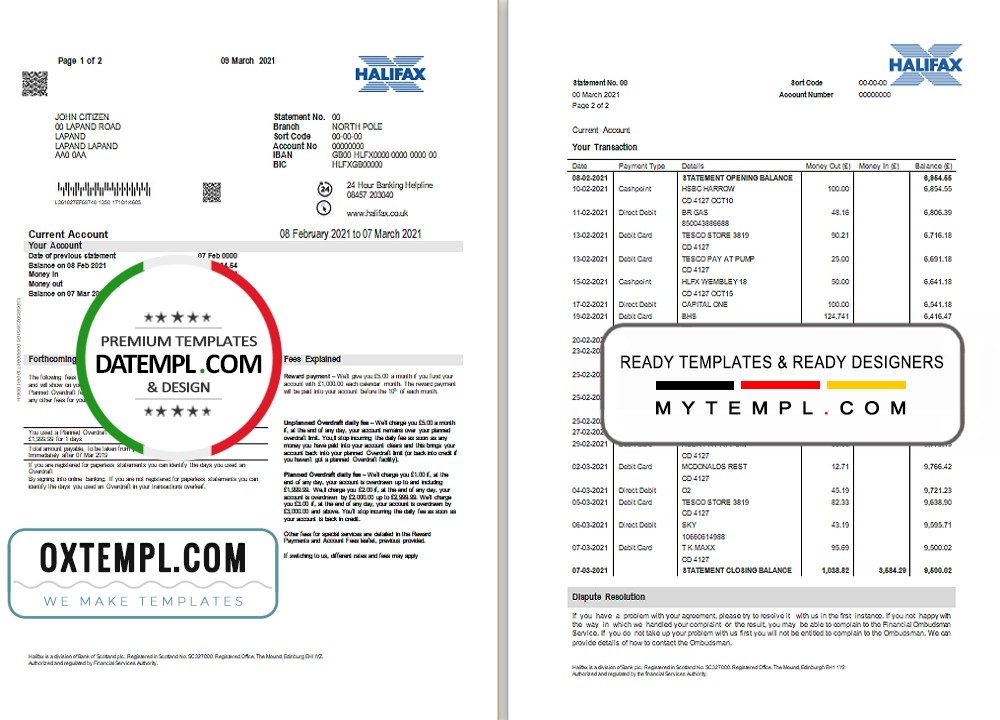 Completely editable United Kingdom Halifax bank statement 3 – 6 months example (2 pages) of high quality, which may be used as a proof of address on many sites.
