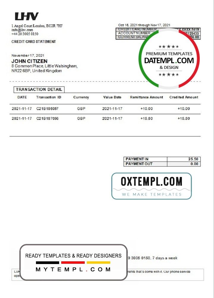 Completely editable United Kingdom LHV bank statement 3 – 6 months sample of high quality, which may be used as a proof of address in many sites.