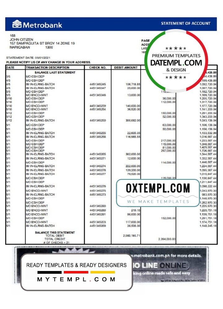 Fully editable United Kingdom Metrobank bank statement 3 – 6 months example of high quality, which may be used as a proof of address in many sites.
