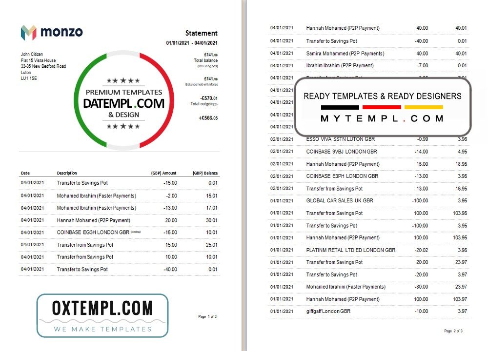 Here you see a bank statement 3 – 6 months sample of British large bank – Monzo.