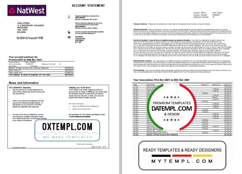 Fully editable United Kingdom Natwest bank account statement example of high quality, which may be used as a proof of address in many sites.