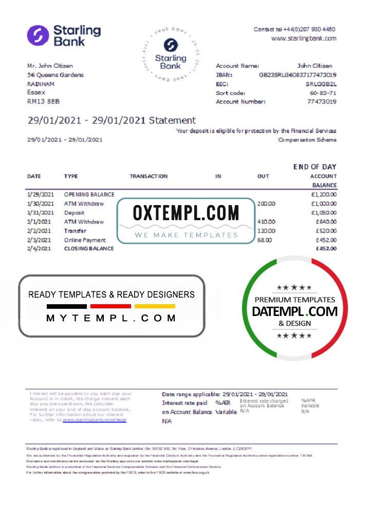 Fully editable United Kingdom Starling bank statement example of high quality, which may be used as a proof of address in many sites.