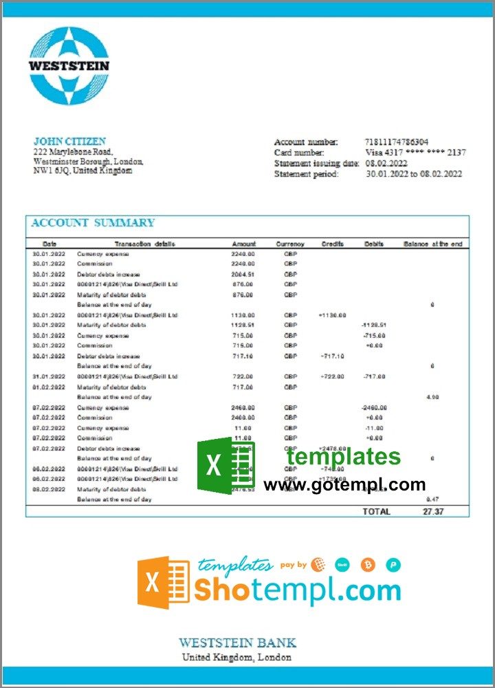Completely editable United Kingdom WestStein bank statement 3 – 6 months sample of high quality, which may be used as a proof of address in many sites.