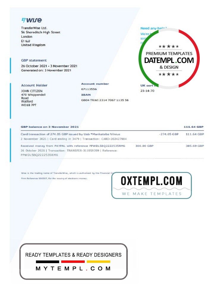Completely editable United Kingdom Wise bank statement 3 – 6 months sample of high quality, which may be used as a proof of address in many sites.
